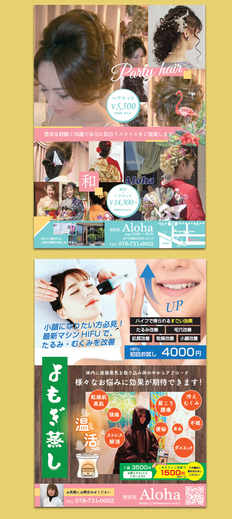 ・着付けや、ヘアセットの技術をアピールしたい ・よもぎ蒸しやHIFEの宣伝もしたい
