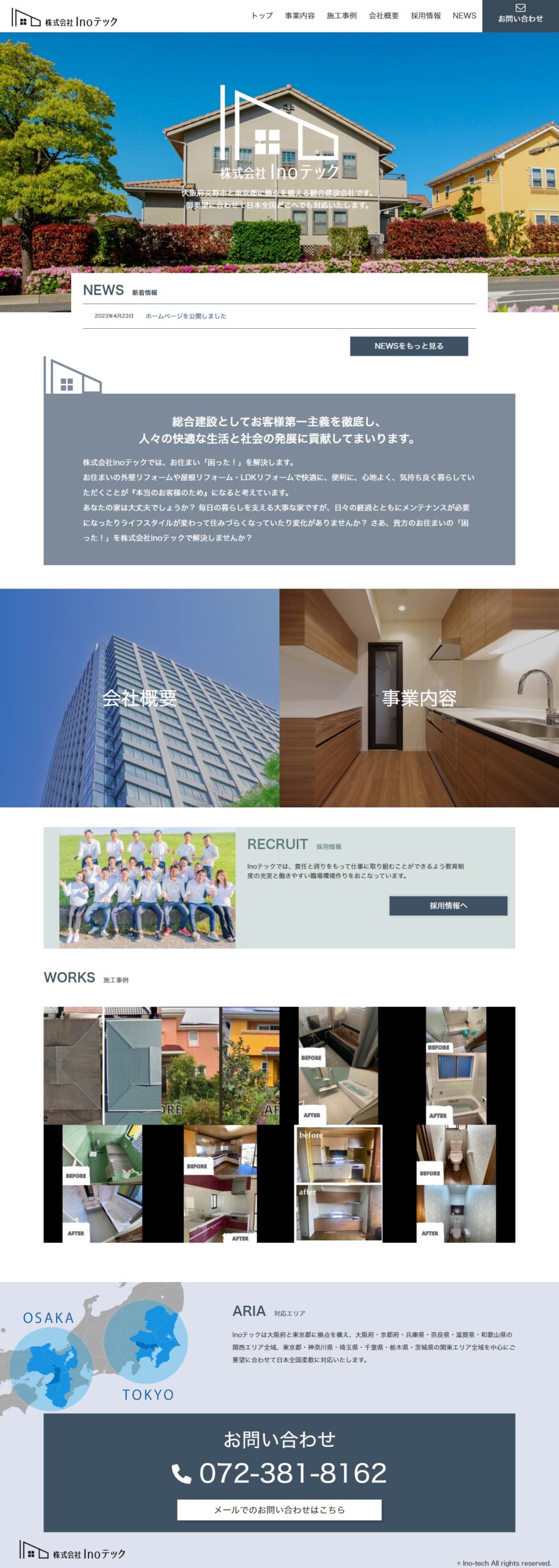 建設会社のHP Inoテック 公開日/制作日:2023年04月01日 URL:https://ino-tech.org/ 建設会社様のWEBサイトを制作させていただきました。個人を対象としたホームページがご希望でした ターゲット ・BtoC 目的 新規事業立ち上げのためにWEBサイトが必要となった 設計 トップ 会社概要 事業案内 施工事例 採用情報 お問い合わせ デザイン FVで動きのあるアニメーションをご希望でした。 制作期間 2週間 使用ツール Photoshop / illustrator / DreamWeaver / WordPress