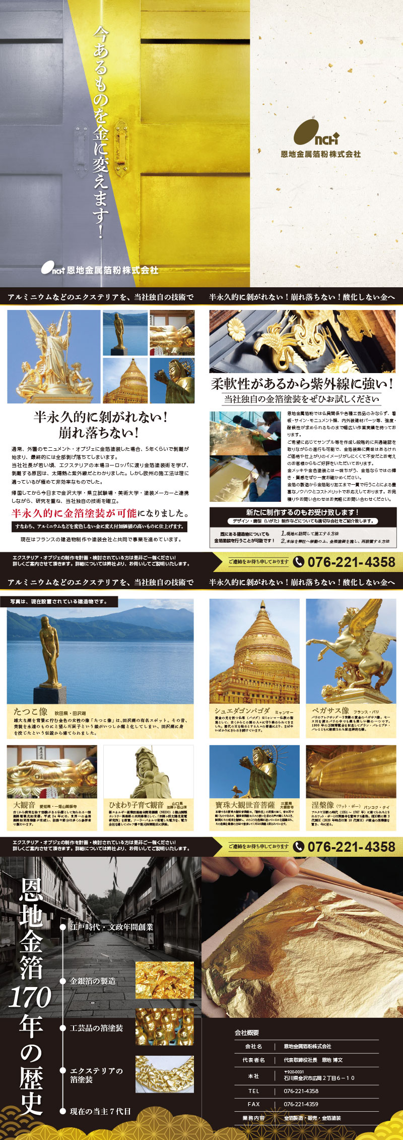 金箔加工会社のパンフレット 恩地金属箔粉株式会社 公開日/制作日:2023年04月01日 URL:https://onchikinzoku.com/ 金箔加工会社様の会社案内を制作させていただきました。元々、WEBサイトの方を制作させていただき、そちらが大変気にいられたとの事でパンフレットの制作もご依頼いただきました。 ターゲット ・新規・既存クライアント ・BtoB用 目的 営業の際、お客様への業務内容説明のため 設計 既存サイトをパンフレットに落とし込む デザイン 既存サイトのデザイン 制作期間 3日 使用ツール illustrator