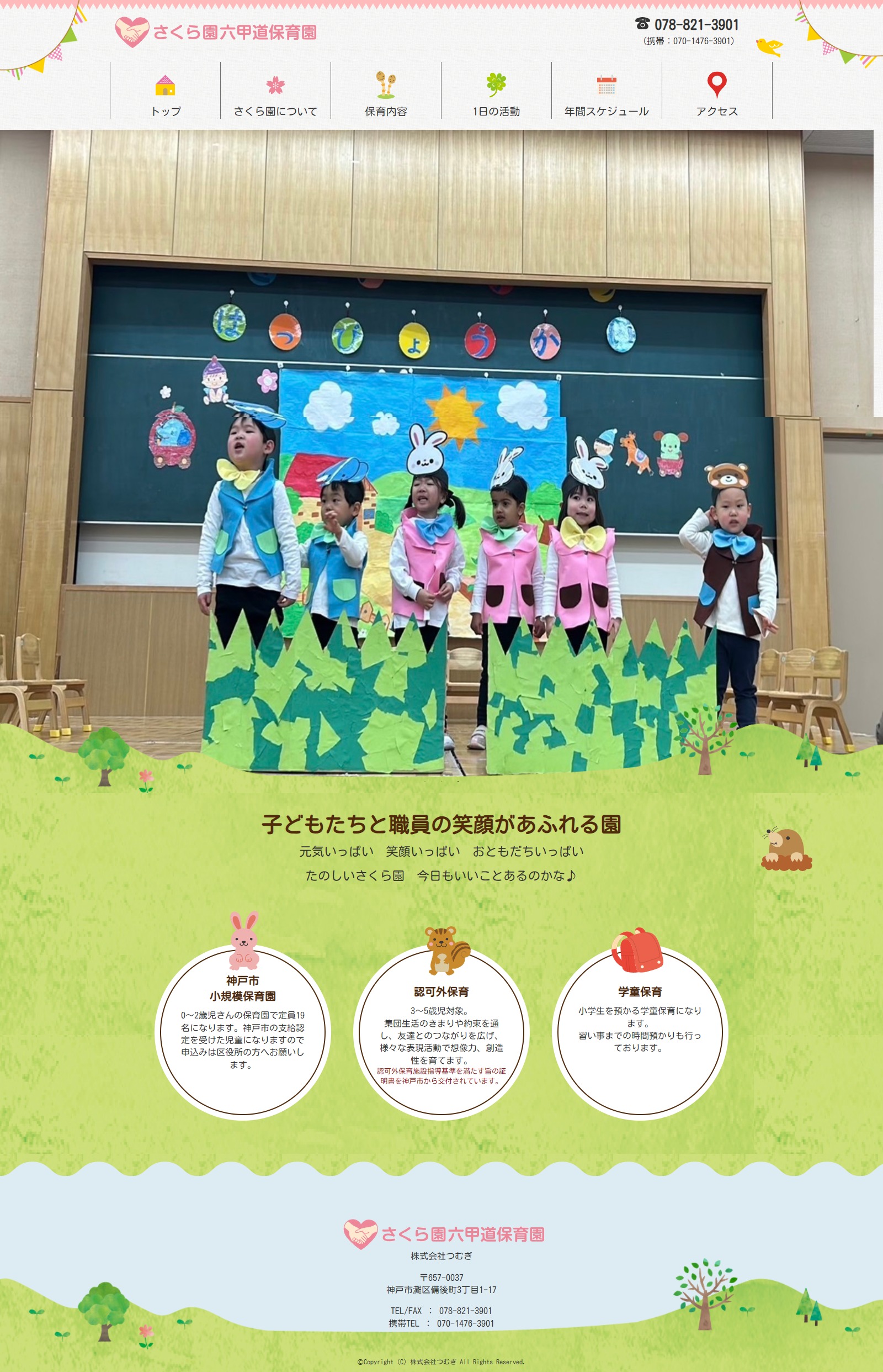保育園のHP さくら園保育園 公開日/制作日:2022年03月28日 URL:https://sakuraen-rokkomichi.org/ 保育園のホームページを制作しました。みやすくかわいらしいイメージで制作しました ターゲット 保護者 目的 会社名が変更になるとのことで急遽HPが必要となった 設計 トップページ ┗園長あいさつ ┗保育内容 ┗年間スケジュール ┗1日の活動アクセス ┗お問い合わせページ デザイン 保育園という事でかわいらしいイメージで制作させていただきました 制作期間 2週間 使用ツール Photoshop / illustrator / DreamWeaver / WordPress