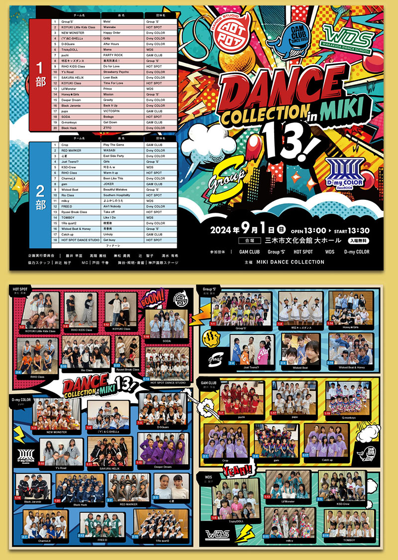 ・表紙はチラシと同じデザインで関連性を持たせる ・中面は見開きで出演チームを団体ごとにわかりやすくまとめる ・表4はスケジュールを見やすくデザイン